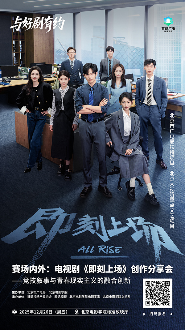 为深入探讨该剧在职场现实主义叙事、青春群像塑造、剧综联动创新、城市文化表达等方面的创作经验,由北京市广电局、北京电影学院主办,首都视听产业协会、腾讯视频、北京电影学院电影学系、文学系承办的“赛场内外:电视剧《即刻上场》创作分享会”将于12月26日在北京电影学院举办,为中国职场剧、现实题材创作及影视与城市文化融合提供可持续的思考与启迪。