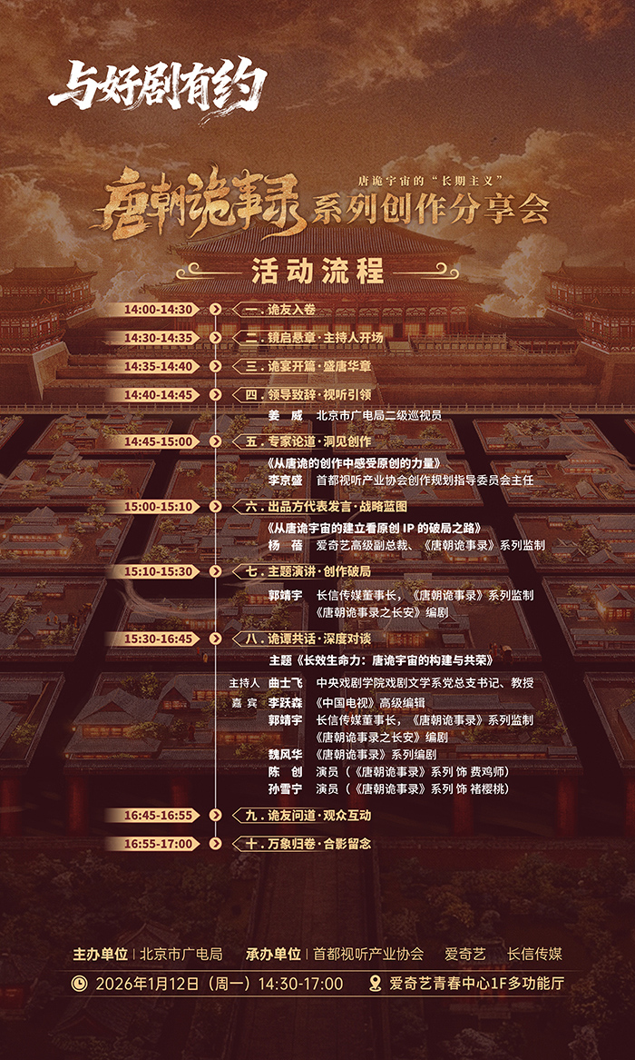 为深入解析该系列在创作方法论、IP构建与全产业链开发上的成功路径,由北京市广电局主办,首都视听产业协会联合爱奇艺、长信传媒承办的“与好剧有约——《唐朝诡事录》系列创作分享会”将于2026年1月12日(周一)14:30-17:00,在爱奇艺举办。本次活动以“唐诡宇宙的‘长期主义’”为主题,汇聚政、产、学、研及核心主创多方力量,旨在系统梳理《唐诡》从内容创作到产业开发的完整经验,共同探讨国产影视从“流量思维”向“价值思维”的转型路径,提炼原创IP长效发展的核心逻辑。