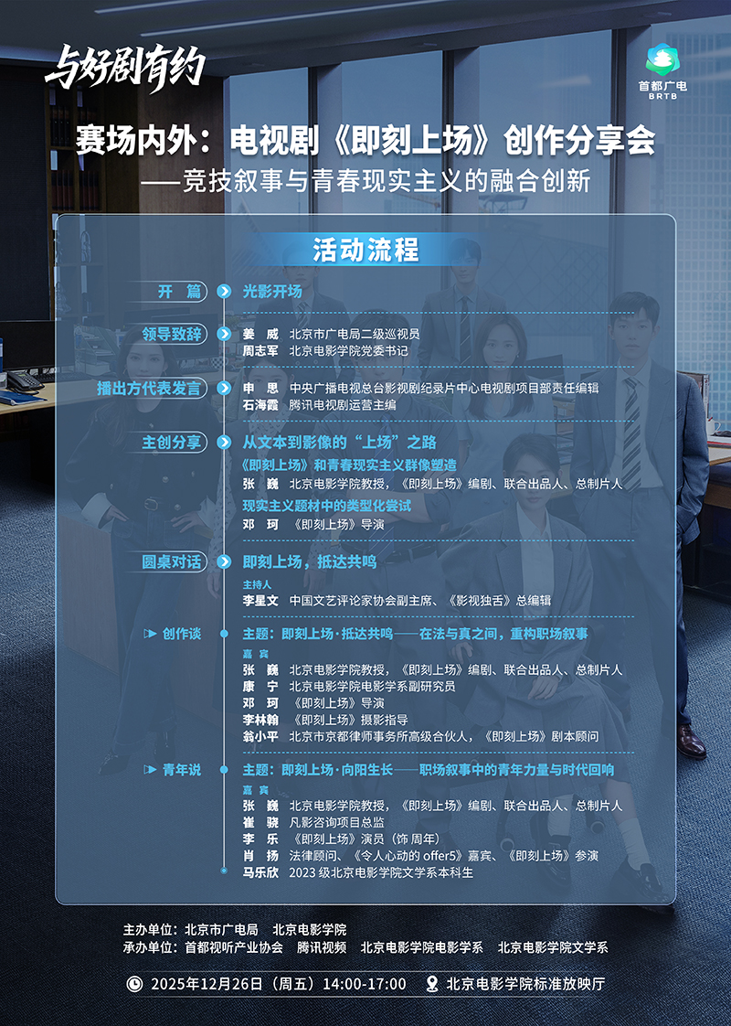 为深入探讨该剧在职场现实主义叙事、青春群像塑造、剧综联动创新、城市文化表达等方面的创作经验,由北京市广电局、北京电影学院主办,首都视听产业协会、腾讯视频、北京电影学院电影学系、文学系承办的“赛场内外:电视剧《即刻上场》创作分享会”将于12月26日在北京电影学院举办,为中国职场剧、现实题材创作及影视与城市文化融合提供可持续的思考与启迪。